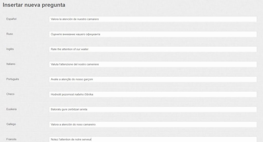 5. A continuación, aparecerán todos los idiomas disponibles, tendrás que escribir la pregunta que quieras cada una con su correspondiente idioma y pulsar el botón guardar. Esta operación la debes realizar tantas veces como nuevas preguntas quieras, siguiendo los mismos pasos, primero pulsando el botón de nueva pregunta y a continuación escribiendo las traducciones de la pregunta.